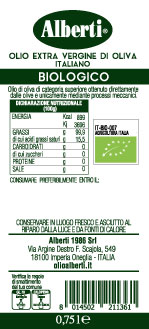 L’olio extra vergine di oliva biologico Alberti è di color verde intenso con riflessi dorati .