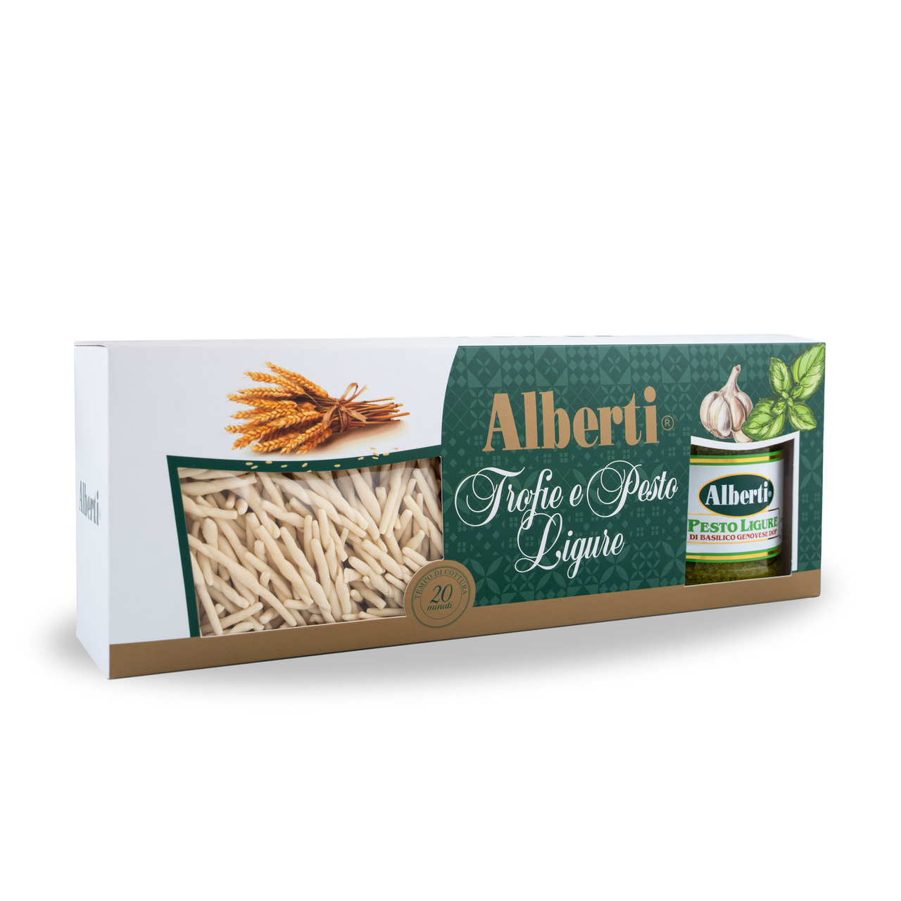 Comoda confezione composta dalle tipiche Trofie Liguri ed il nostro ottimo Pesto ligure di basilico Genovese DOP in elegante vaso ottagonale.