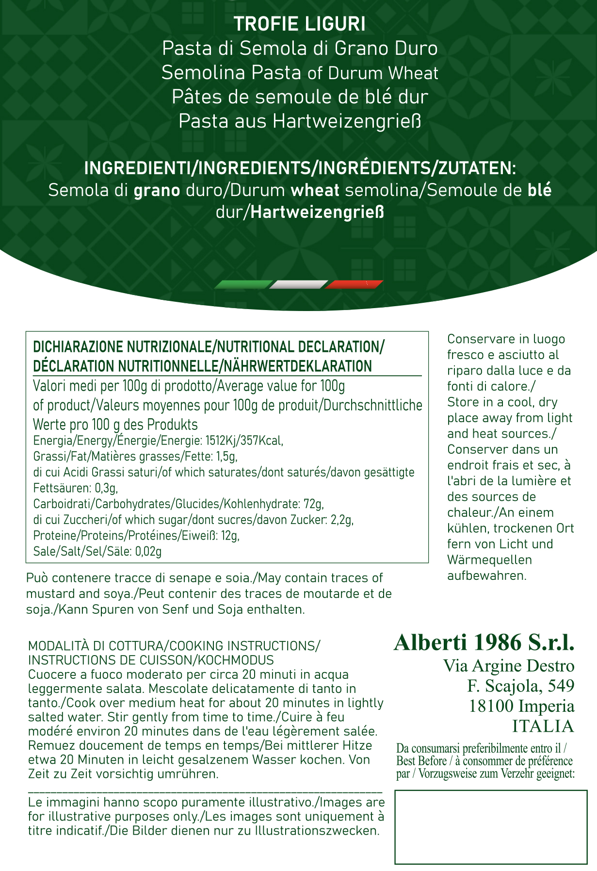 Far cuocere le Trofie in abbondante acqua salata per 20 min. Scolare e condire a freddo con il Pesto precedentemente diluito con 2/3 cucchiai di acqua di cottura. Aggiungere Parmigiano Reggiano e olio extra vergine di oliva Alberti.